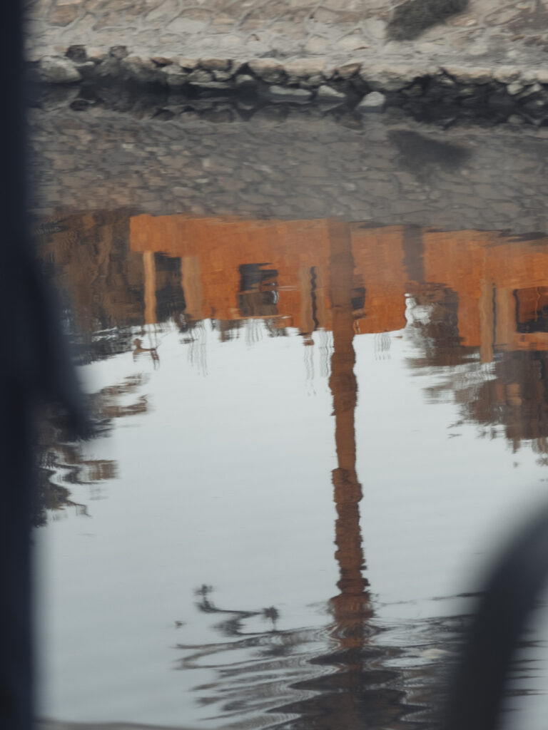 Nos detenemos. Ajustamos el paso al ritmo del lugar. Observamos cómo la luz resbala por una pared agrietada, cómo la tela tendida dialoga con la madera que la sostiene, cómo el tiempo deja su rastro en el reflejo tembloroso del agua y en la huella fosilizada de una piedra. Son vestigios que hablan del paso del tiempo, de la presencia humana y de la naturaleza abriéndose camino, invitándonos a imaginar la vida en lo que ahora es ruina y a reconocer en cada detalle un fragmento de algo más grande.